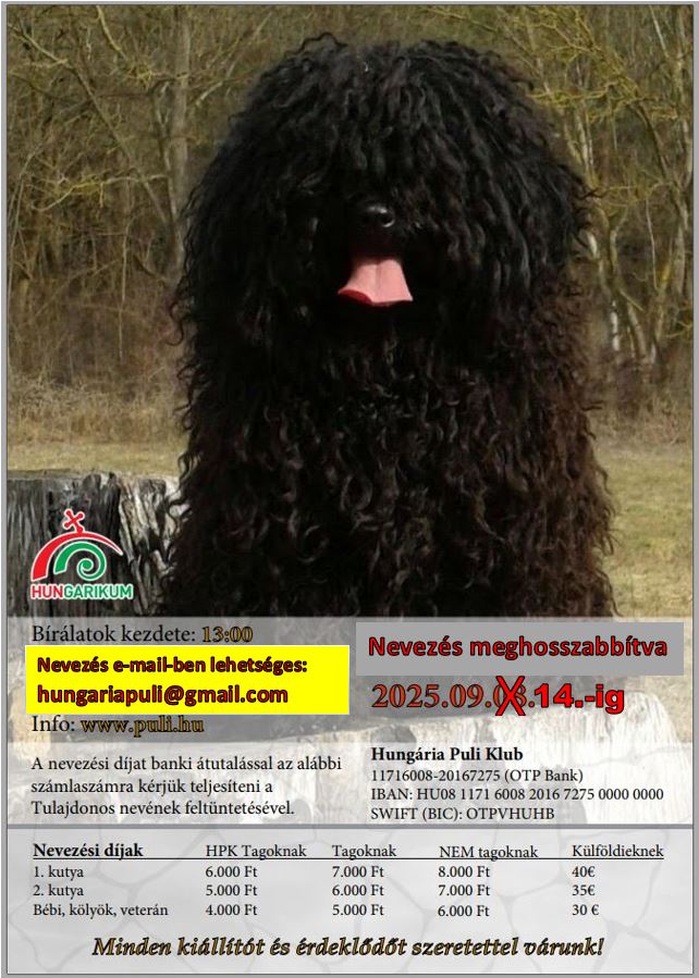 Description - NEVEZÉSI LEHETŐSÉG MEGHOSSZABBÍTVA 2025.09.14.-ig. Szeretettel osztjuk meg klubunk-Speciál CAC, tenyészszemlével egybekötött kiállításunk felhívását, amely a Kecskemét-Jakabszállás 3XCACIB dog show keretein belül lesz megrendezve. nevezés: hungariapuli@gmail.com